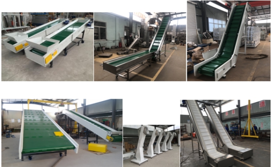 爬坡皮带输送机适用于楼层或高差间的货物的连续输送。倾斜角度小(≤30°)的爬坡皮带机,在皮带上加装档条、治具、裙边等方式从而使物体能在较大的角度上作提升输送。具有效率高、输送快、噪音低、不间断等特点。特别适合小物料的输送,如食品、注塑件、粉末以及各种零件行业。 用于上下楼层、斜坡地形、天桥等具有高差的平面之间的物品输送。在某些情况下可以代替升降机使用。 在输送颗粒状物品时为防止物品因重力滚落,每隔一段距离可以加一块挡板.裙边皮带输送机通过在输送带上增设提升挡板、裙边等附件,所有附件均采用高频焊接,无缝接驳,采用尼龙机加工压轮,是输送带运行平稳,能满足颗粒物以及粉体的提升工艺要求,广泛应用于食品、化工、医药等行业。